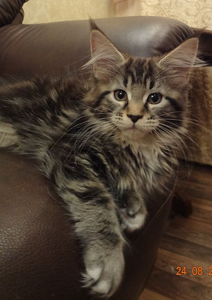 У него корректный профиль, сильный подбородок, хороший постав ушей, длинные кисточки ,мощный костяк, длинный и очень пушистый хвост, богатая шуба).